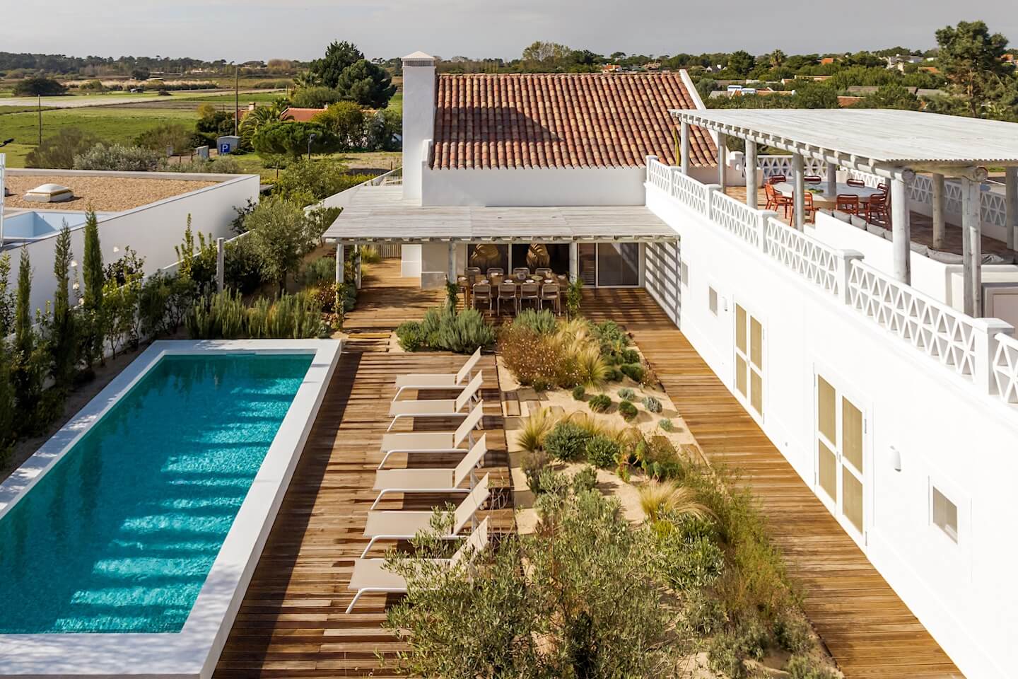 Contemporary yet intimate, this charming property is ideal for families and has four ensuite bedrooms - three doubles (one can be converted into a twin) and a double bunk bedroom especially suitable for children. The sunlit interiors include a mezzanine level over the living room, offering a quiet nook for reading, watching a movie, or playing games. An open-plan kitchen, dining, and living area flows onto a shaded dining terrace, a lovely spot for breakfast with views of the pool. The downstairs terrace and pool surround are decked and beautifully framed by Mediterranean plants. At the end of the day, you can head up to the magnificent rooftop terrace for sundowners and front-row seats to experience the soft, shifting tones of those special Comporta sunsets. Designed for outdoor living the terrace has a built-in barbeque, dining and lounging areas, perfect for long laid-back meals with loved ones.